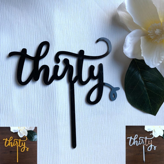 This beautiful 'thirty' cake topper is laser cut from 1/8" thick acrylic and is approx. 13cm wide and 15cm tall with 5cm stakes for easy insertion into your cake